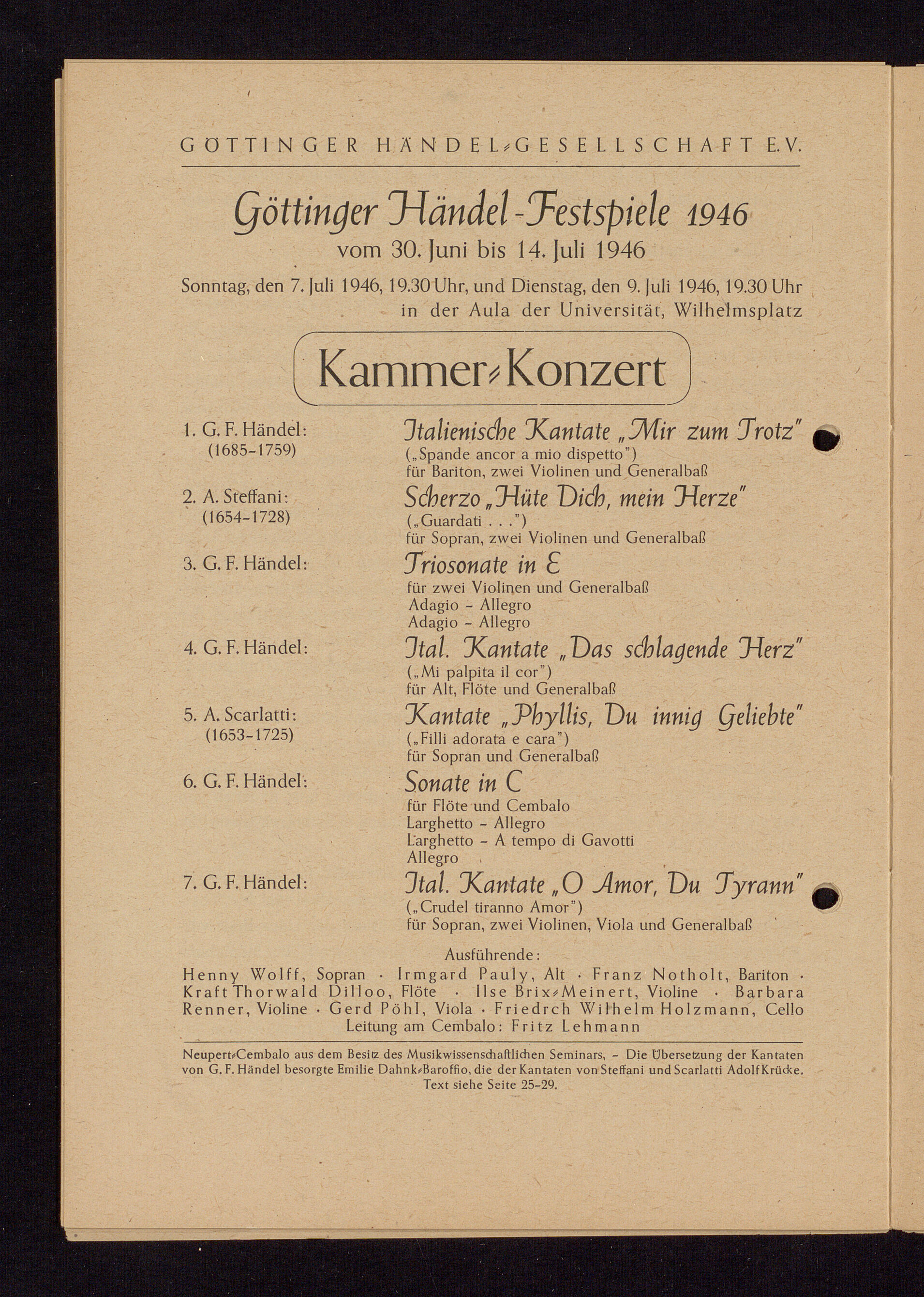 Vom 30. Juni bis 14. Juli 1946 konnte die Göttinger Händel-Gesellschaft e.V. bereits wieder eine Oper aufführen. Ariadne war in Deutschland zum ersten Mal zu sehen. Passend zur britischen Besatzung in Göttingen hielt Prof. Dr. Rudolf Gerber den Festvortrag „Händel und England“. Außerdem standen noch Kammerkonzerte mit drei italienischen Kantanten und Sonaten von Georg Friedrich Händel auf dem Programm.